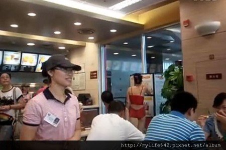 近日一段《江陰KFC驚現火紅粗曠內衣姐》的影片,吸引上萬名網友點閱。長約一分鐘的影片顯示,一名身穿紅色內衣褲的女子在肯德基的廣告板前觀看,彷彿若有所思,旁邊的工作人員及顧客都不好意思地笑了;女子非常淡定,走向櫃台並拿起菜單端詳,一名喝著可樂的男子猛盯著她看。